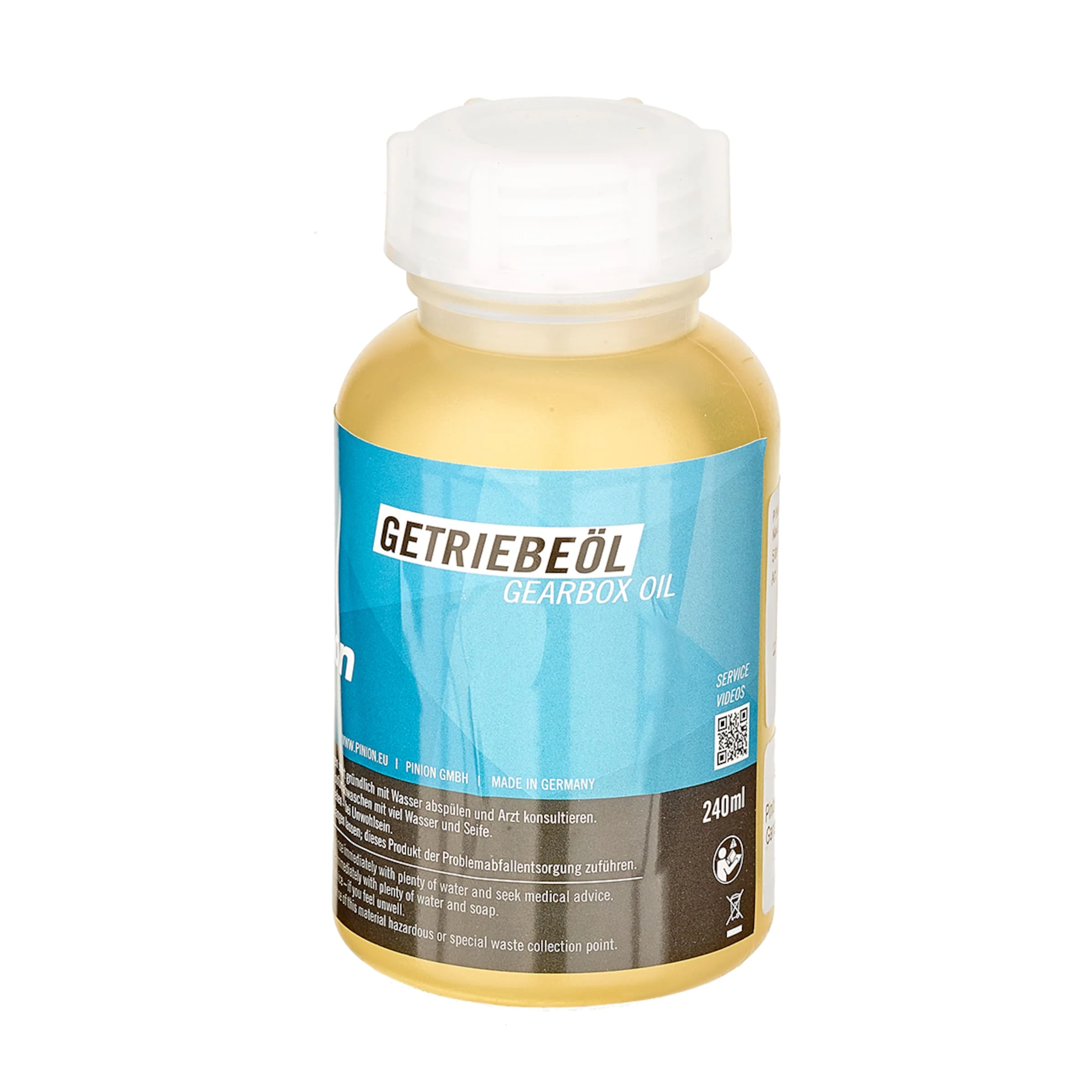 Oil change kit includes a 60 ml bottle (enough for 1 oil change) of genuine Pinion 4 season gearbox oil. The bottle features an applicator tip that fits the oil fill port of Pinion C-Line gearboxes used on all Priority models.